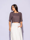 Blusa confeccionada em tecido leve de viscose com linho (70% viscose, 30% linho), garantindo toque fresco, caimento solto e conforto para o dia a dia. Possui modelagem cropped com mangas amplas e comprimento mais curto, trazendo um visual moderno e descomplicado. O decote arredondado complementa o design minimalista, perfeito para compor looks casuais e elegantes com facilidade.
