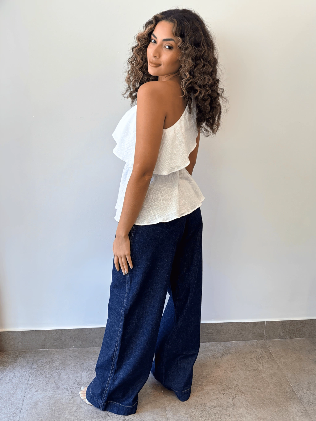 Calça jeans de cintura alta com modelagem reta, clássica e atemporal. Possui fecho com botão e zíper, dois bolsos funcionais na frente e dois bolsos traseiros usados como detalhe, mantendo o visual tradicional do denim. Confeccionada em 100% algodão, com forro do bolso 50% algodão e 50% poliéster, garantindo conforto e durabilidade.