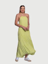 Confeccionado em 100% viscose com forro 100% poliéster, o modelo traz leveza e movimento ao look. Possui decote ajustável com amarração no pescoço, costas abertas e saias em camadas franzidas, que criam um efeito delicado e feminino. O caimento solto proporciona conforto e um visual descontraído, ideal para dias quentes ou produções casuais sofisticadas.